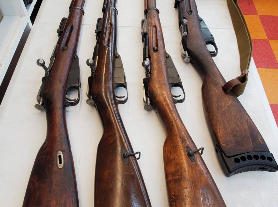CONSIGNMENT, MIL SURP!, Pre-OwnedFebruary 18, 2026FROM LEFT TO RIGHT. 1917 REMINGTON M91 MOSIN NAGANT $950. 1908 IZEVSK M91 MOSIN $750. 1915 NEW ENGLAND WESTINGHOUSE MOSIN $899. 1944 M44 MOSIN $399. THE M91’S ARE CONSIGNMENT ITEMS. **M44 SOLD**