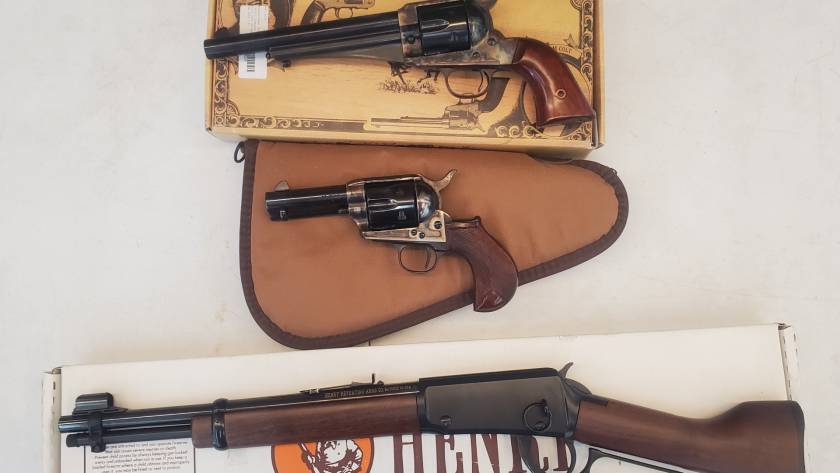 TOP TO BOTTOM. (CIMARRON 1875 OUTLAW 45L.C. $499) (CIMARRON THUNDERER 44 W.C.F. $399) (HENRY MARE’S LEG 22LR $350) **MARE’S SOLD** February 13, 20260CommentsRead More
